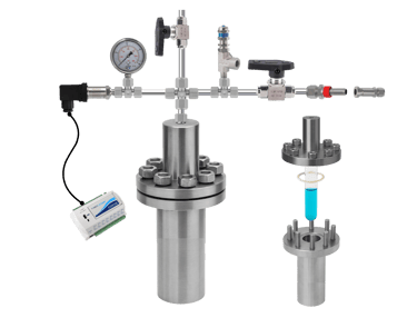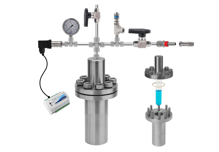 Construído em aço inox 316, com suporte para pressões de até 200 bar e compatível com tubos de ensaio, possibilitando reações a um volume de até 5mL e monitoramento gráfico da queda de pressão com retirada de alíquotas gasosas.