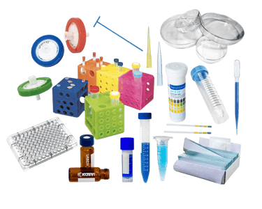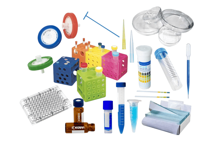 Ponteiras, tubos e microtubos de centrifugação, placas de Petri, swabs, filtros para seringa, barras magnéticas, cubetas de vidro, viais e muito mais.
