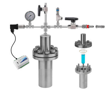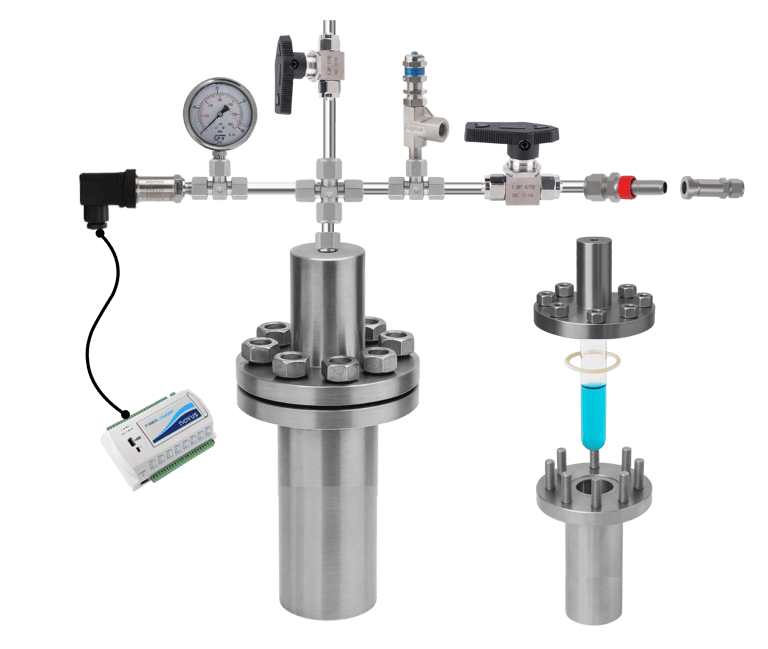 Construído em aço inox 316, com suporte para pressões de até 200 bar e compatível com tubos de ensaio, possibilitando reações a um volume de até 5mL e monitoramento gráfico da queda de pressão.