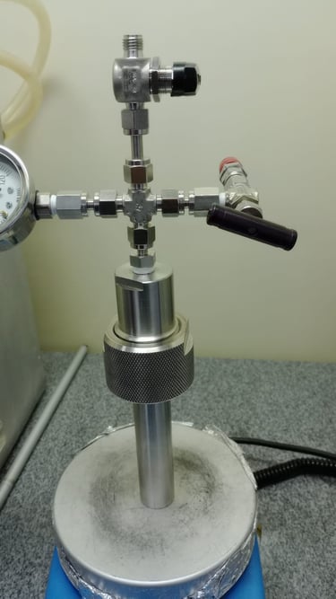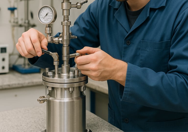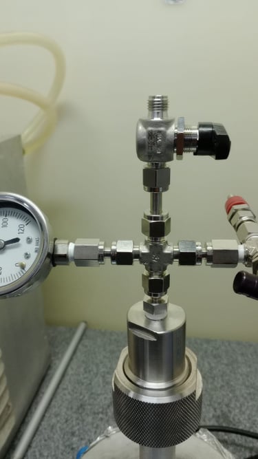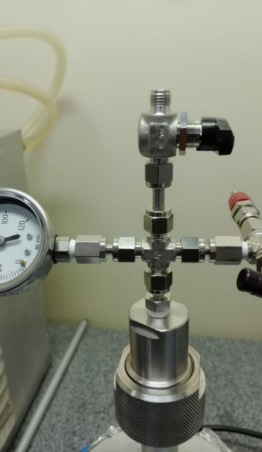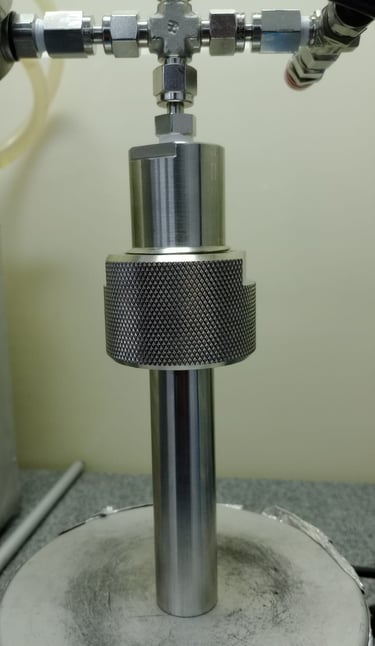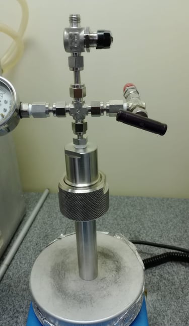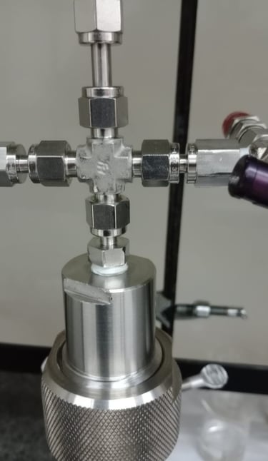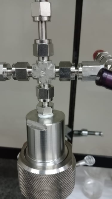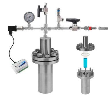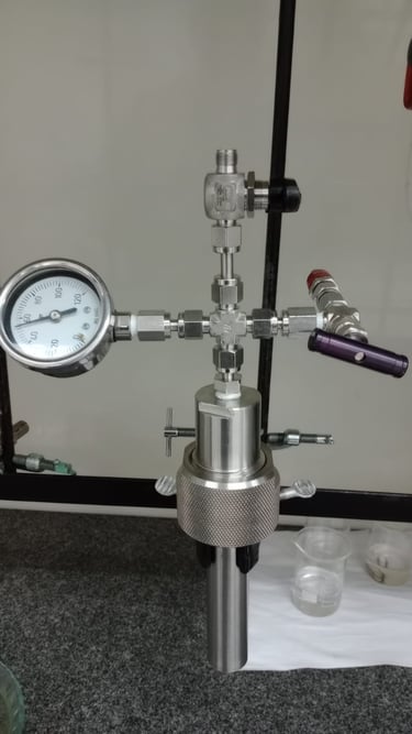 Um reator de alta pressão construído em aço inox 316, com suporte para pressões de até 200 bar e compatível com tubos de ensaio de 13x100mm possibilitando reações a um volume de até 5mL e monitoramento gráfico da queda de pressão com retirada de alíquotas gasosas através de seringa. Otimizado para pequenos volumes e totalmente personalizável para sua aplicação.