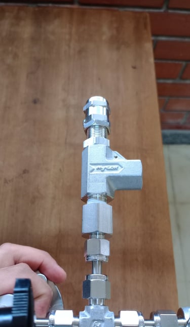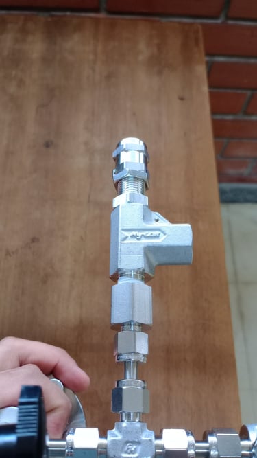 É realizada a análise de qualidade da usinagem, e a montagem dos conectores hy-lok. Ao final, é aferida a presença de vazamentos nas conexões.